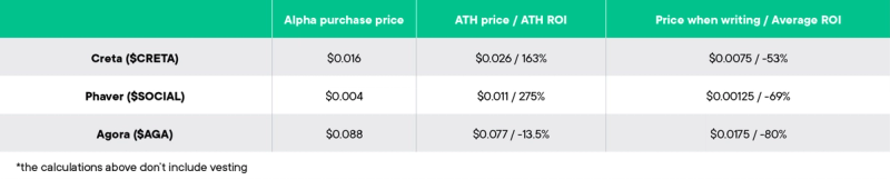 Même si les projets passent notre processus de due diligence, il est inévitable qu'il y ait certains dont la performance des tokens souffre pour des raisons imprévues. Les jetons actuellement en bas de notre liste sont Creta, Agora et Phaver.