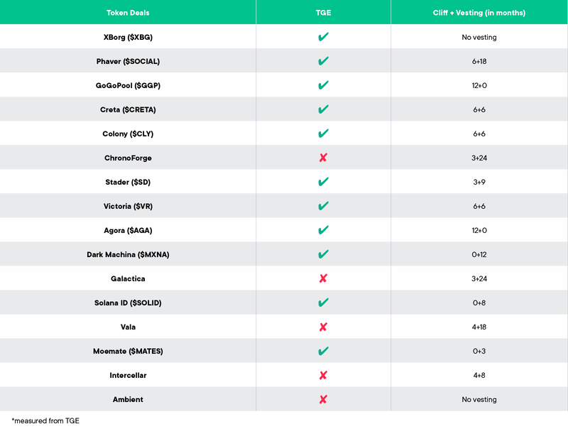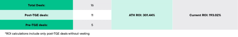 En plus de ceux mentionnés ci-dessus, il y a aussi 3 autres Token Deals post-TGE et 7 pré-TGE. Les premières incluent Stader, Colony et Victoria VR, tandis que les secondes incluent ChronoForge, Dark Machine, Galactica, Vala, MoeMate, Intercellar & Ambient.