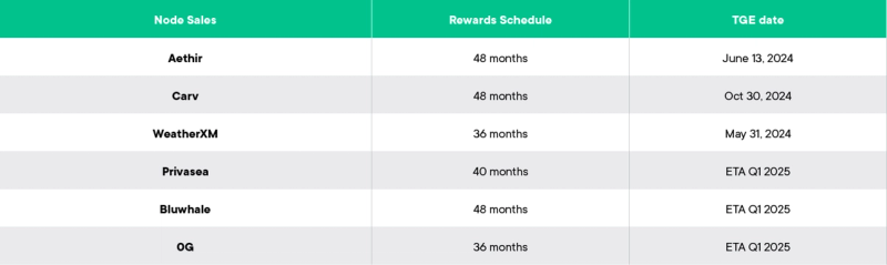 Nous avons effectué six ventes de nœuds jusqu'à présent - Aethir, Carv, WeatherXM, Privasea, Bluwhale et 0G. Les trois premiers d'entre eux sont déjà en fonctionnement et leur token est disponible.