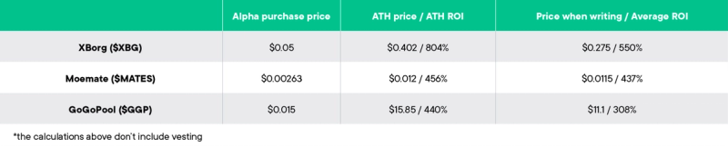 Comme vous pouvez le constater, 16 Token Deals ont été introduits par SwissBorg Alpha jusqu'à présent. Parmi eux, 9 ont déjà eu leur TGE, et nous estimons que les 7 restants s'en rapprochent. Si l'utilisateur n'avait dépensé que 100 $ sur tous les Deals post-TGE, il aurait investi 900 $ et actuellement aurait 1 753 $, presque 2 fois leur mise de départ, avec la performance la plus élevée atteignant presque 3 fois.