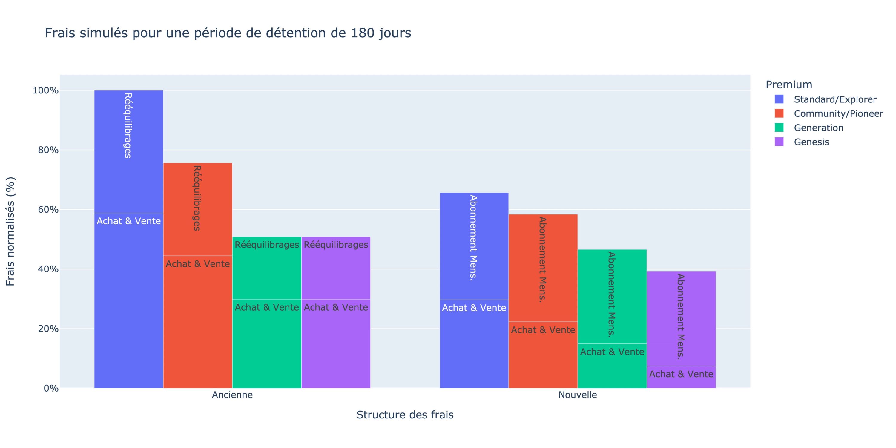 Les frais sont simulés pour une période de détention des Thématiques de 180 jours, y compris les frais d'achat et de vente, avec une fenêtre glissante de 3 jours, à partir du 1/11/2020 afin de prendre en compte les différents régimes de marché. Nous représentons les frais normalisés par rapport aux frais standards de l'ancienne structure. Le graphique ci-dessus montre que la nouvelle structure de frais est plus avantageuse pour tous les utilisateurs.