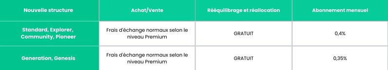 Nous disons "au revoir" aux frais de rééquilibrage, "goodbye" aux frais de réallocation et "chömmed guet hei" aux frais d'échange élevés. Il ne restera plus qu'un abonnement fixé à 0,35% par mois pour nos utilisateurs Premium.