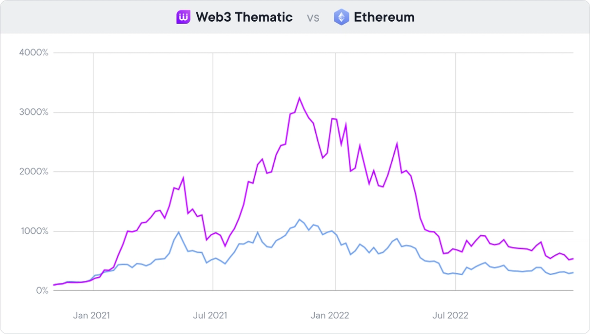 Le graphique ci-dessous montre la performance sur 2 ans de la Thématique Web3 par rapport à l'Ethereum, le deuxième token le plus important de l'espace, ce qui indique que la diversification dans les cryptomonnaies permet souvent de récolter les plus grandes récompenses tout en protégeant contre les chutes les plus sévères.