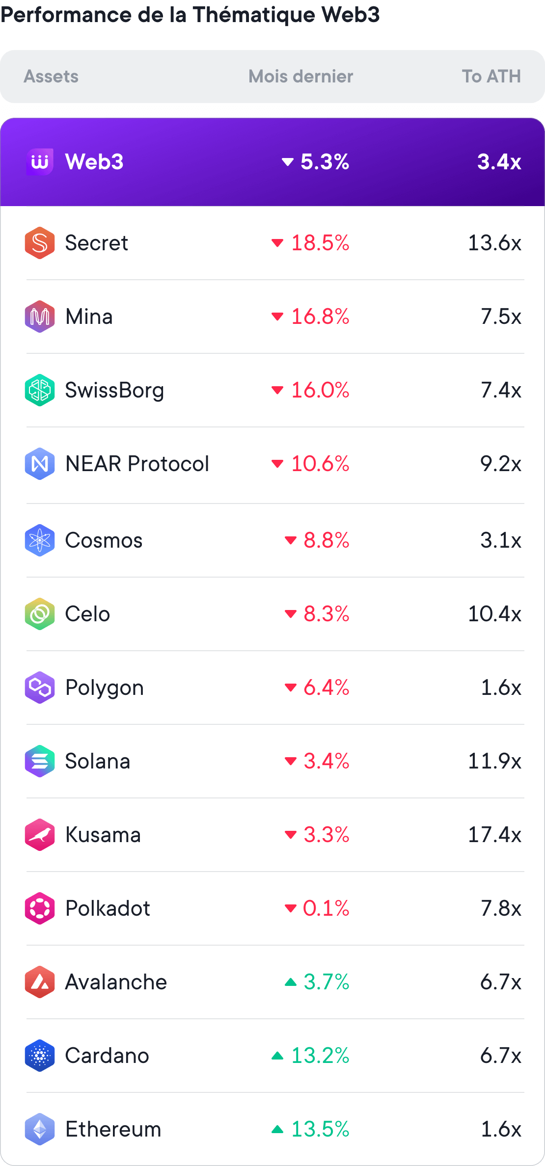 Ci-dessous se trouve la performance de la Thématique Web3 par rapport aux actifs individuels. La colonne du dernier mois représente la performance de janvier et la colonne "To ATH" (du All Time High) représente les gains que nous ferions si les actifs revenaient à leur prix le plus élevé de tous les temps.